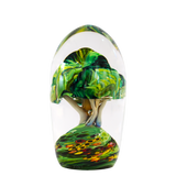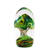 These paperweights are built up in layers starting from the hillock on which the trees stand, up through the branches to the canopy. Finally, the whole sculpture is encased in a thick layer of clear glass. The sculpture is worked at between 800 and 1000 degrees Celsius on the end of a steel rod. The tree weight is then cooled slowly in a kiln for about two weeks.