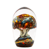These paperweights are built up in layers starting from the hillock on which the trees stand, up through the branches to the canopy. Finally, the whole sculpture is encased in a thick layer of clear glass. The sculpture is worked at between 800 and 1000 degrees Celsius on the end of a steel rod. The tree weight is then cooled slowly in a kiln for about two weeks.
