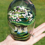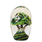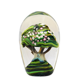 These paperweights are built up in layers starting from the hillock on which the trees stand, up through the branches to the canopy. Finally, the whole sculpture is encased in a thick layer of clear glass. The sculpture is worked at between 800 and 1000 degrees Celsius on the end of a steel rod. The tree weight is then cooled slowly in a kiln for about two weeks.